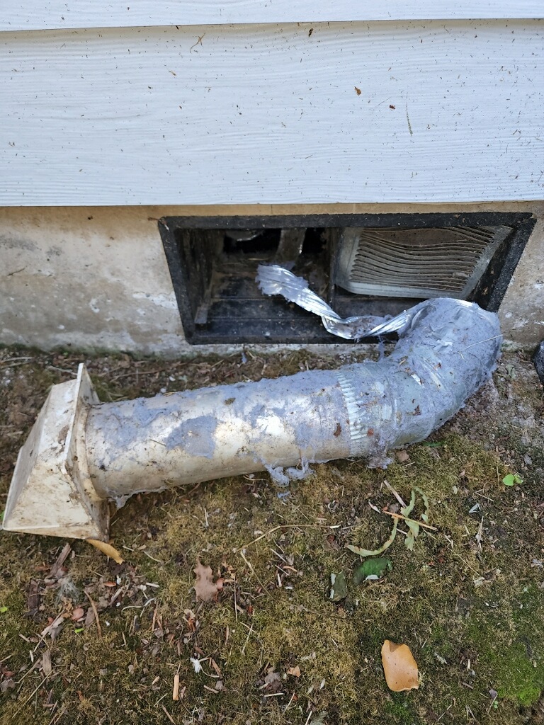 Repairs use only code-compliant materials. Rigid metal duct for straight runs. Approved flexible metal for connection sections. Pest-resistant exterior caps with unrestricted airflow. No plastic. No foil accordion hose. No shortcuts that create the same failure two years later.